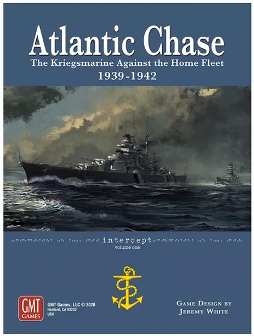 “Atlantic Chase” simulates the naval campaigns fought in the North Atlantic between the surface fleets of the Royal Navy and the Kriegsmarine between 1939 and 1942. It utilizes a system of trajectories to model the fog of war that bedeviled the commands during this period. Just as the pins and strings adorning Churchill’s wall represented the course of the ships underway, players arrange trajectory lines across the shared game board, each line representing a task force’s path of travel. Without resorting to dummy blocks, hidden movement, or a double-blind system requiring a referee or computer, players experience the uncertainty endemic to this period of naval warfare.