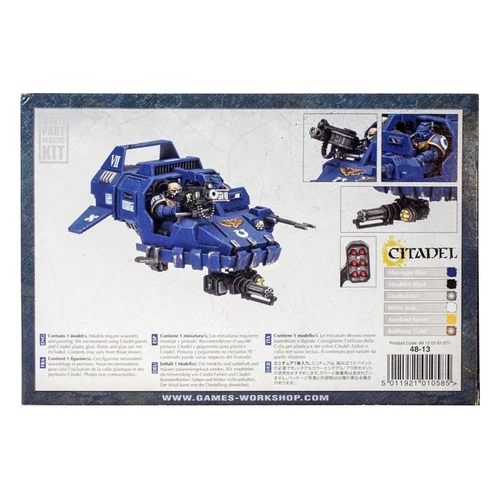 This box set contains one multi-part plastic Space Marine Land Speeder. This 60-piece kit allows you to assemble a Land Speeder Typhoon. Alternatively it can be used to build a Land Speeder or Land Speeder Tornado. This set contains an assault cannon, a heavy flamer, a Typhoon missile launcher, a multi-melta and a heavy bolter. Also included are decals for the Blood Angels, the Dark Angels, the Ultramarines and the Space Wolves.
