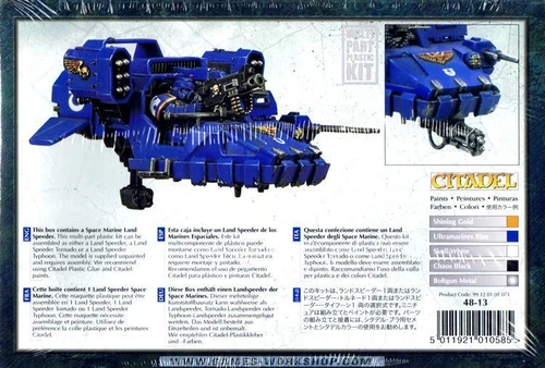 This box set contains one multi-part plastic Space Marine Land Speeder. This 60-piece kit allows you to assemble a Land Speeder Typhoon. Alternatively it can be used to build a Land Speeder or Land Speeder Tornado. This set contains an assault cannon, a heavy flamer, a Typhoon missile launcher, a multi-melta and a heavy bolter. Also included are decals for the Blood Angels, the Dark Angels, the Ultramarines and the Space Wolves.
